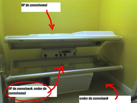 ter verduidelijking dit verhaaltje: Marianne kwam binnen in het kamertje waar haar zonnebank stond. Ze hing haar badjas aan het haakje en zette haar pantoffels onder de zonnebank. Daarna zette ze de radio zachtjes aan, stelde ze de zonnebank in en ging er onder liggen. Bij haar pantoffels. Duidelijk? Net zoals je OP een luchtbed gaat liggen, ga je ook OP de zonnebank liggen. De zonnehemel hangt dan boven je....