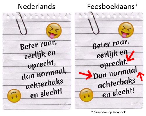 Er is de laatste jaren een niet te ontkennen, en ook niet te stuiten, nieuwe standaard ontstaan in de taalwereld. Eentje die nauw verwant is aan het Nederlands en het Vlaams: Feesboekiaans! In het Feesboekiaans wordt er een geheel eigen gebruik van leestekens gehanteerd, hoofdletters worden anders toegepast en woorden worden afgeschaft of verwisseld.