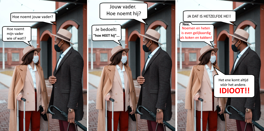 Niet duidelijk? Lees dan even deze zin: Vader antwoordt en zijn antwoord is "ja". Absoluut correct in het Nederlands, maar compleet tegen de kar rijdend in het Feesboekiaans, niet vervelend genoeg. In het Feesboekiaans wordt dat Vader antwoord en zijn antwoordt is "ja".