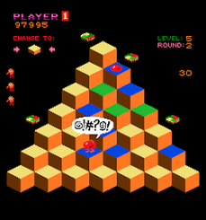 Gedurende de jaren '80 was dit spel ook erg populair in de arcades, in de lunaparken op kermissen en elders, in de spelkasten. Q*bert is een geslurfd wezentje dat je op een piramyde moet laten rondspringen. Elk vlak waar hij op landt verandert van kleur en elk vlak moet verkleurd worden. Kijk ook uit voor de vijanden en atrributen waar je niet mee in aanraking mag komen. Het glinsterende vakje links en rechts naast de piramyde is een lift, deze kan je elk één keer gebruiken om terug naar boven te gaan.